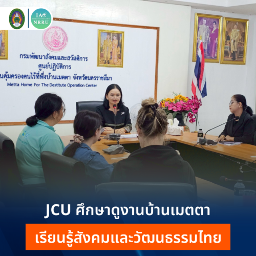 วันที่ 5 พฤศจิกายน 2568 กองวิเทศสัมพันธ์ สำนักงานอธิการบดี มหาวิทยาลัยราชภัฏนครราชสีมา ได้นำนักศึกษาแลกเปลี่ยนจาก James Cook University (JCU) เครือรัฐออสเตรเลีย เข้าศึกษาดูงาน ณ สถานคุ้มครองคนไร้ที่พึ่งบ้านเมตตา จังหวัดนครราชสีมา เพื่อเรียนรู้บทบาทภารกิจของหน่วยงานด้านสังคมสงเคราะห์ ตลอดจนแนวทางการดูแล ช่วยเหลือ…