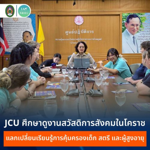 เมื่อวันที่ 3 พฤศจิกายน 2568 กองวิเทศสัมพันธ์ สำนักงานอธิการบดี มหาวิทยาลัยราชภัฏนครราชสีมา นำนักศึกษาแลกเปลี่ยนจาก James Cook University (JCU) เครือรัฐออสเตรเลีย และนักศึกษาผู้ปฏิบัติหน้าที่ล่ามแปลภาษา เดินทางศึกษาดูงานหน่วยงานด้านการจัดสวัสดิการสังคมในจังหวัดนครราชสีมา ได้แก่ สถานคุ้มครองสวัสดิภาพผู้เสียหายจากการค้ามนุษย์ (บ้านนารีสวัสดิ์) และบ้านพักเด็กและครอบครัวจังหวัดนครราชสีมา เพื่อรับฟังข้อมูลเกี่ยวกับบทบาท…
